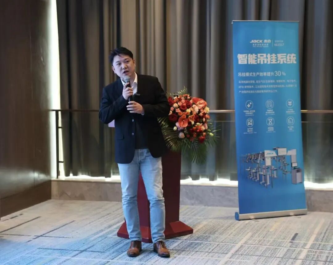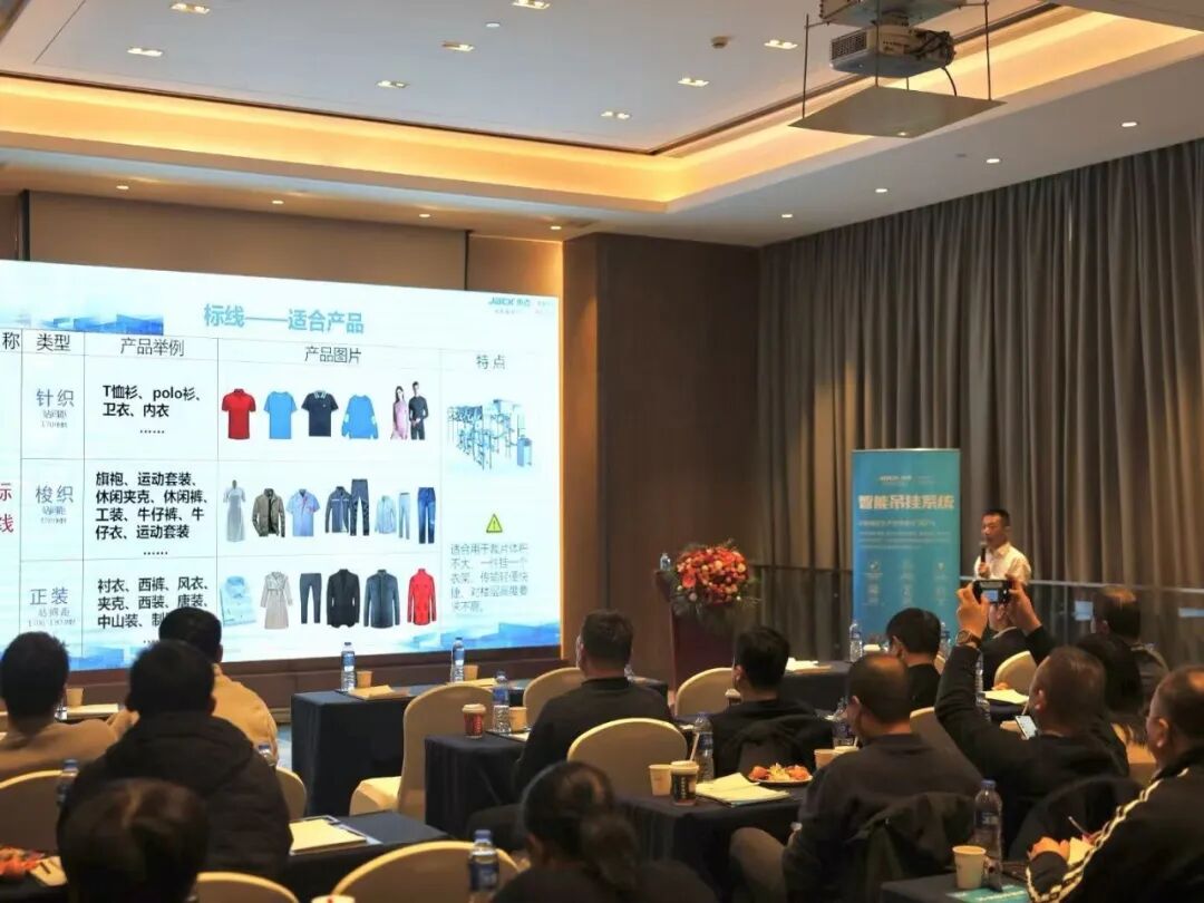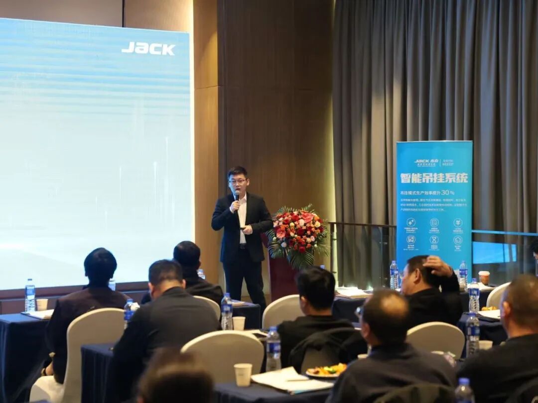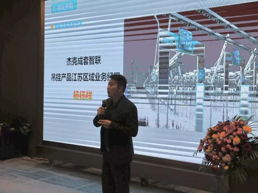 随后,杰克吊挂产品江苏区域业务经理杨扬样、高端与软件市场部业务总监杨铧分别详解吊挂系统的适配场景,以及配套软件在生产进度追踪、数据可视化方面的功能价值,二者协同实现了 “精准流转、透明管理” 的智能化生产闭环。