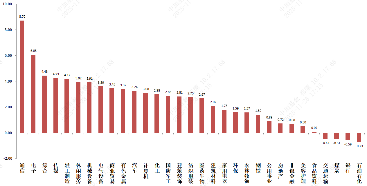 31个申万一级行业中通信、电子和综合相对表现较好。