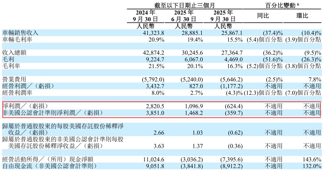 更让人担忧的,是理想汽车的盈利能力。在连续十一个季度稳定盈利后,理想在2025年第三季度首次出现亏损,6.24亿元的净亏损与2024年同期28.21亿元的净利润形成鲜明对比;非美国通用会计准则下的经调整净利润也达到-3.60亿元。