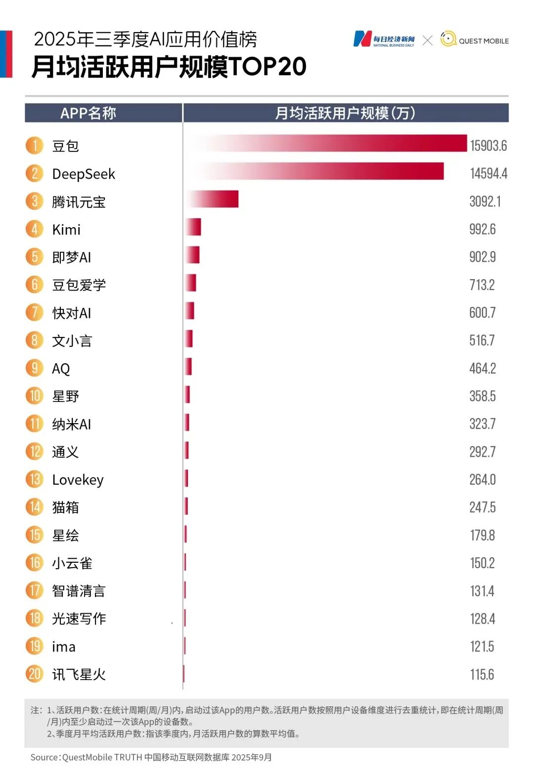 QuestMobile数据显示,今年9月,中国月活跃用户排名前三的AI应用中,豆包、DeepSeek、腾讯元宝分列前三,MAU分别为1.72亿、1.45亿、3286万。夸克虽未单独列出,但阿里系产品中表现最佳的也远未进入第一梯队。