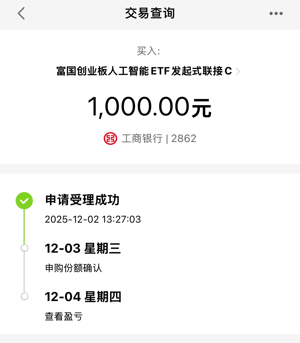个人操作1:今天加仓人工智能,买入1000元$富国创业板人工智能ETF发起式联接C(OTCFUND|024663)$!人工智能方向今天加仓一笔!这两天科技开始反弹,想找个好买点只能追涨,今天终于走个小幅回撤,倒车接人的机会来了!人工智能行业未来我还是非常看好的,技术迭代加速推动大模型向更强、更高效、更可靠方向发展,算力需求持续释放,国产AI芯片进入量产交付阶段,技术成熟度提升且受政策与供应链安全需求驱动,市场集中度有望提升;同时,AI商业化应用加速落地,多模态视觉理解、智能体模型等技术突破正拓展至游戏、广告、自动驾驶等领域,形成新的盈利增长点,长线可以继续保持看好。