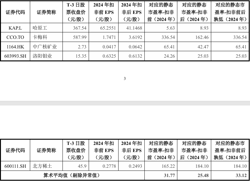 公司的可比公司是哈原工、卡梅科、中广核矿业、洛阳钼业和北方稀土,静态扣非后市盈率25.48倍,参考意义不大。