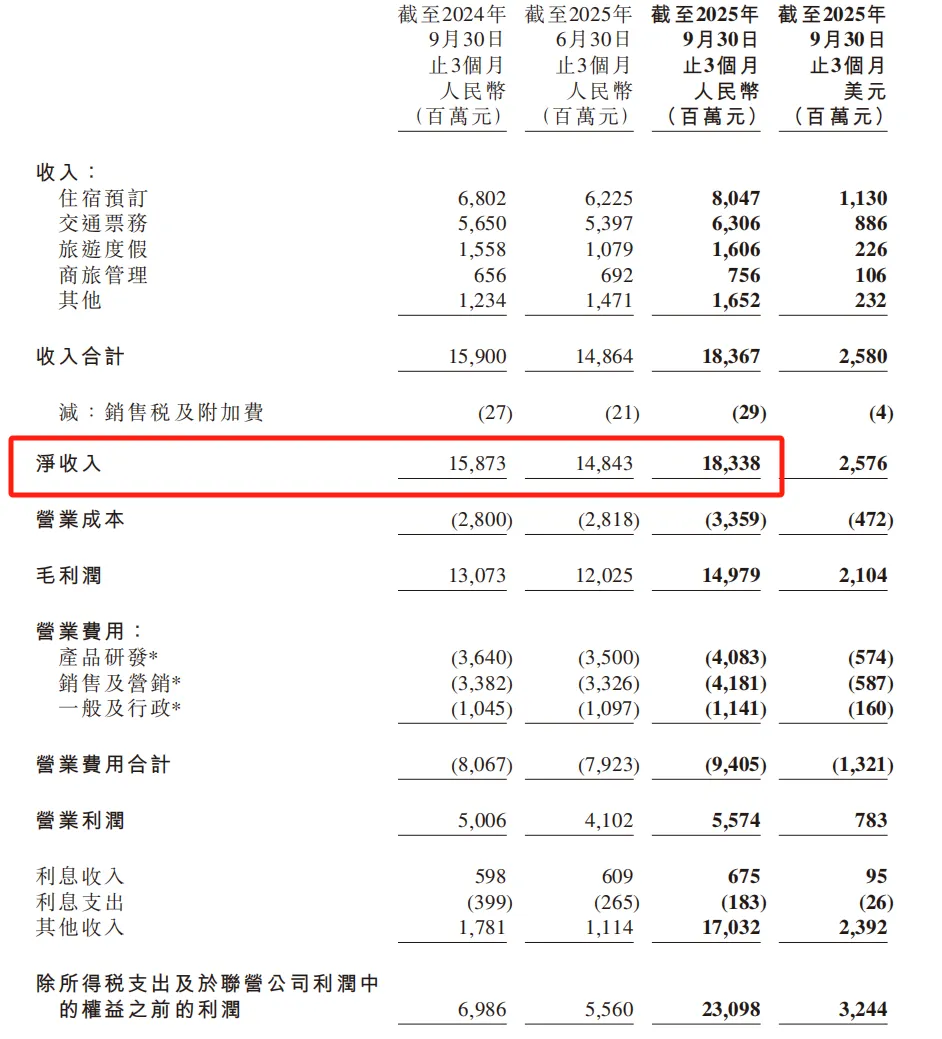 在消费市场整体疲软的大环境下,携程的业绩逆势增长颇具深意。2025年第三季度,公司净利润达到199亿元,但这一数字需要冷静看待——其中包含出售部分海外投资股权带来的一次性收益。