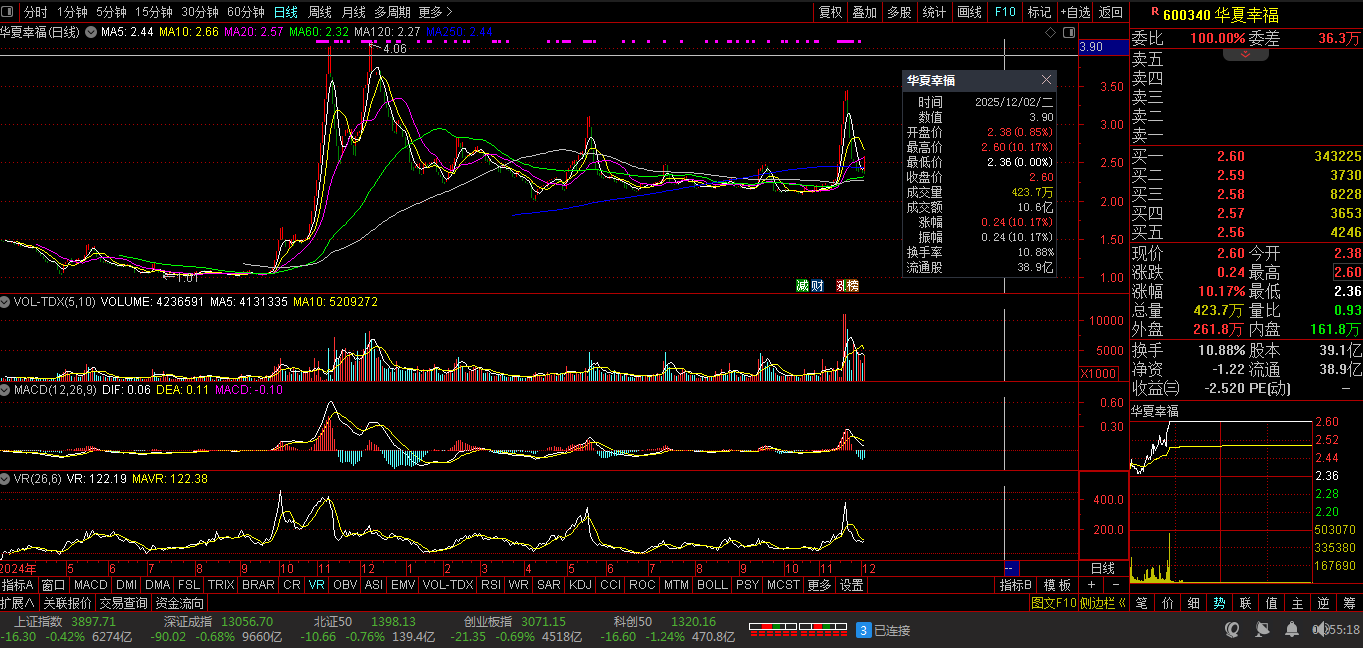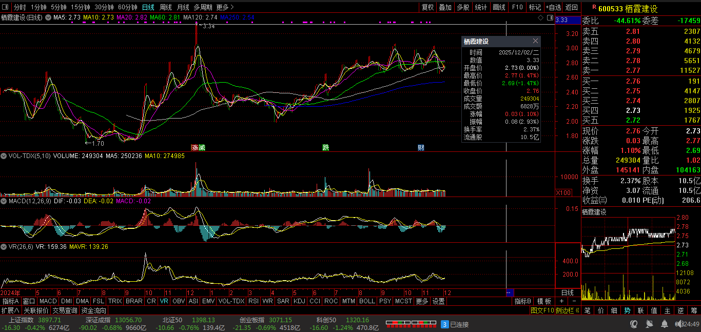 今日视野:前期三顶:酝酿突破。2025-12-02 截止15:00:收盘股价:2.76元,上涨1.10%。成交总量:249304手。成交金额:6828万元。总换手率:2.37%。总市值达:28.98亿元,流通市值:28.98亿元。