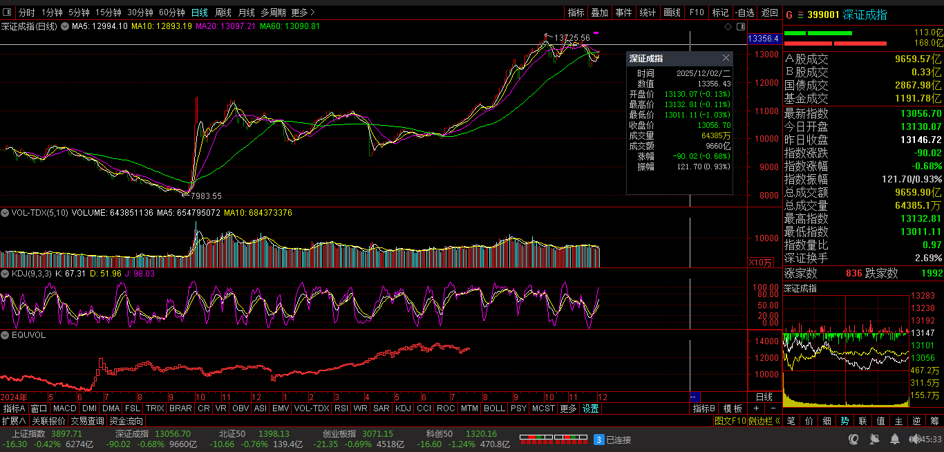 沪深场景:早盘:低开三跌,四涨二跌。午盘:四涨五跌,一涨二跌。尾盘:一涨一跌,次低绿盘。看点之一:沪深股指:沪指低开:盘中震荡,瞬间下探。看点之二:两只乌鸦:深创两指:一度跌逾1%。看点之三:沪深北市:合计成交:16073亿元。场内个股:3740股飘绿。