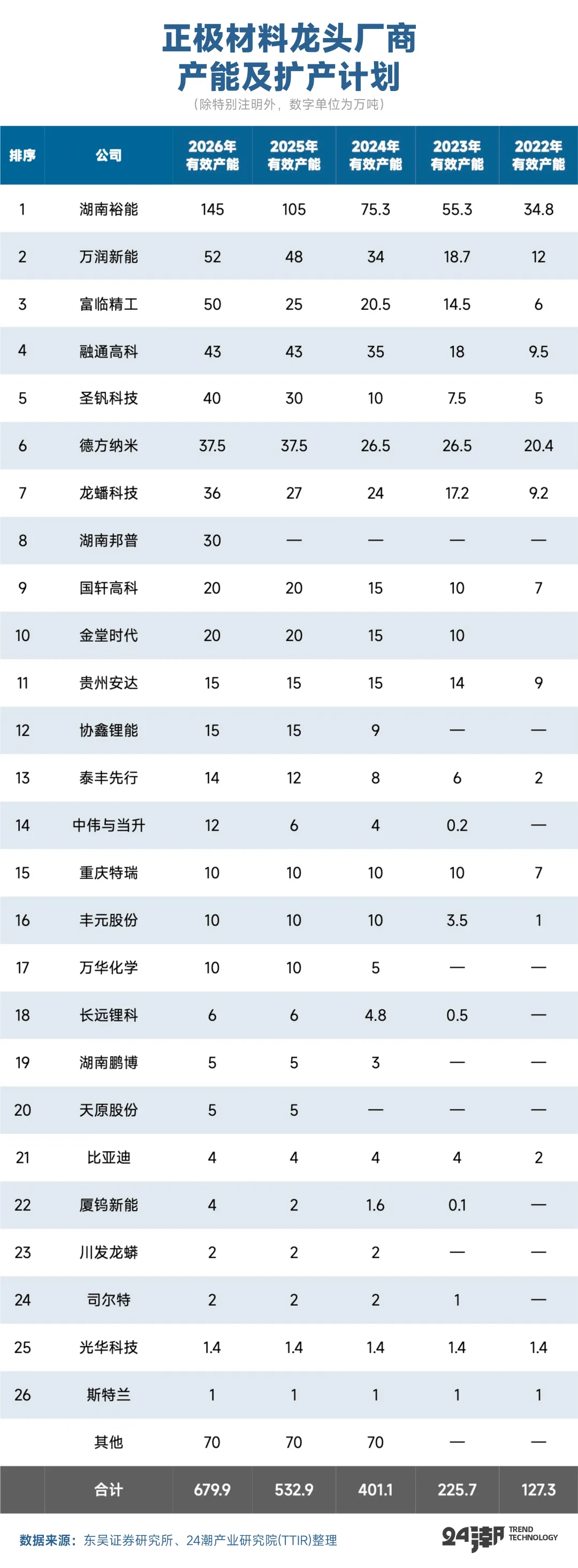 另据东吴证券统计,2024年正极材料有效产能约为401.01万吨,而25年及26年产业预计将持续增长至532.9万吨、679.9万吨,而根据东吴证券预测,25年及26年市场需求约为390.8万吨、516.8万吨,以此计算过剩产能约为142.1万吨、163.1万吨。
