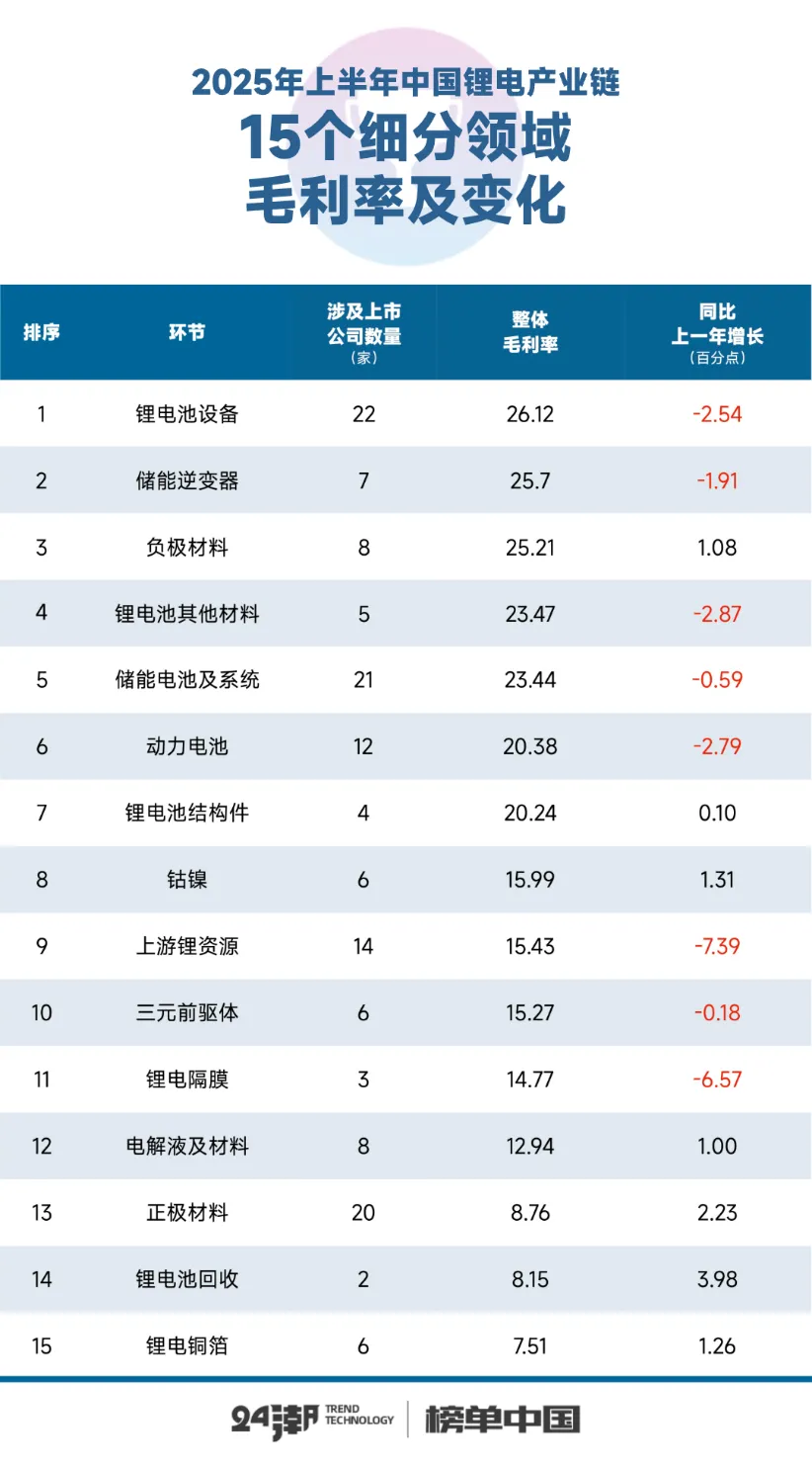从多个数据看,正极材料江湖确实到了非常危险的境地。比如据24潮产业研究院(TTIR)此前统计:2025年上半年,20家上市公司 “正极材料” 业务整体毛利率仅为8.76%,在整个锂电产业领域(15个细分领域)中位列第13位,而下游动力电池企业毛利率是20.38%,盈利能力是前者的2.33倍。