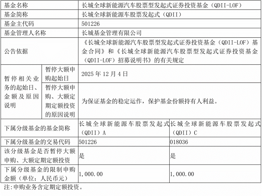 各位基友好,为保证基金的稳定运作,保护基金份额持有人利益,长城全球新能源车自12月4日起A、C份额分别限额1000元。