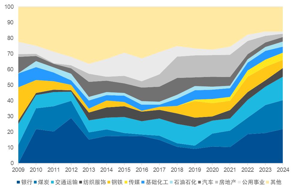 以中证红利指数的行业分布变化为例,银行当前占23%权重,但在2009年其权重几乎为零,在2019年也不足10%;煤炭2016年的权重尚不足1%,2021年后却大幅提升,到2024年已有18%;房地产在2018-2021年曾连续4年一直稳居第一大权重行业,如今也已大幅回落。