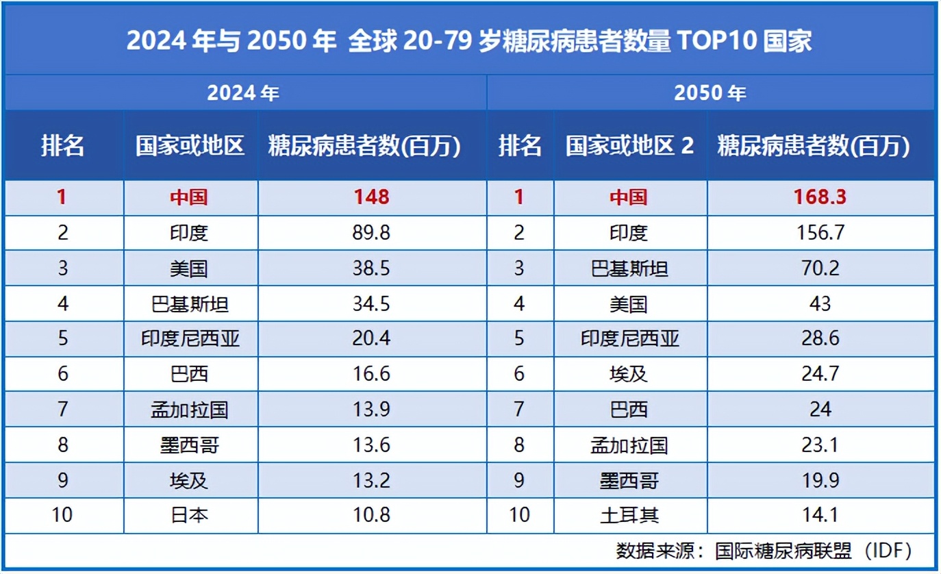 2024年数据显示,中国每10个成年人中就有一个糖尿病,全球20-79岁成人糖尿病患者达5.89亿;预计到2050年,糖尿病患者总数将攀升至8.53亿。
