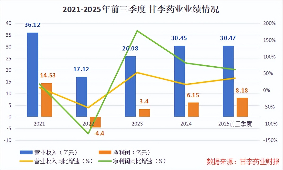 到了2025年前三季度,甘李药业营收冲上30.47亿元,净利润高达8.18亿元,同比增速达61.32%,延续了2023年以来的增长态势。