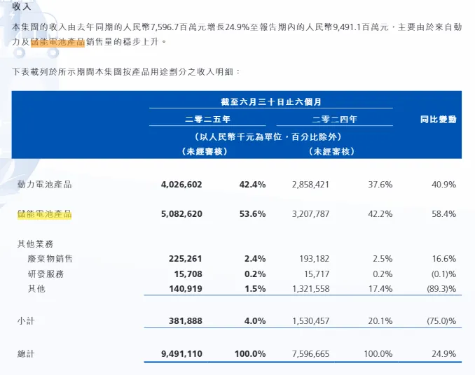 从收入结构来看,储能已经成爲公司第一大收入来源。在今年上半年收入,储能电池产品销售产生的收入同比增长58.4%至50.83亿元,占比达到53.6%。同期动力电池产品销售产生的收入也实现快速增长,同比增长40.9%至40.27亿元。