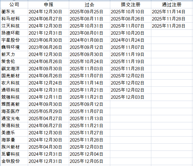 2025年12月2日,国亮新材、农大科技和通领科技同日提交注册。2025年12月3日,兢强科技提交注册。这样的话,各个梯队的公司的非常充足,就等北交所开闸放水。
