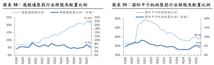 交银国际表示,对于港股医药板块,内外资在2025年均有所增配。2025年前三季度内资持续加仓,但10月以来持股比例小幅回调,截至11月10日持股比例为22.1%(仍高于2024年底 20.8%);外资持仓则在1H25结束了自2021年开始的持续回落态势,但年中以来整体持股比例亦有所回落,截至11月10日,持股比例为38.1%(仍高于2024年底36.0%)。