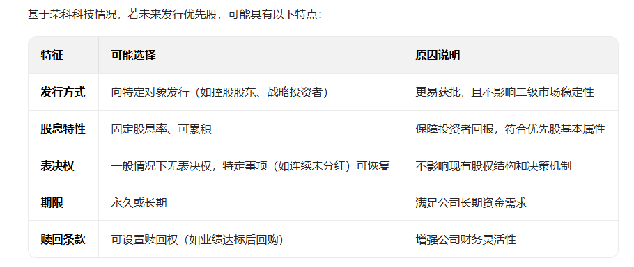 荣科科技目前不存在已发行的优先股,但从公司战略需求、国资背景和政策环境看,未来发行优先股是一种可能的融资选择,特别是在以下场景: