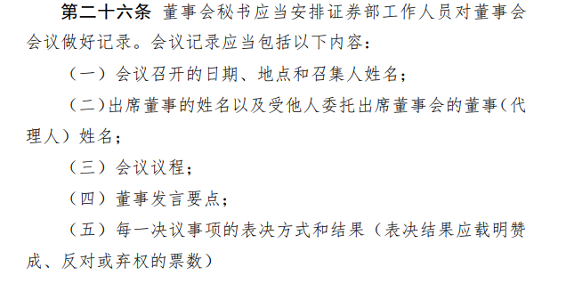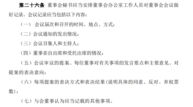 第二十六条大改,会议记录删除“与会董事认为应当记载的其他事项”,删除“会议审议的提案”,删除董事对有关事项的“主要意见、对提案的表决意向”。