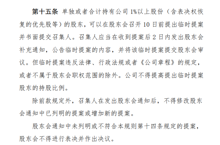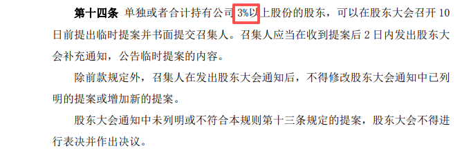 第十五条,是本次的重点。将“3%”修改为“1%”,新增“公司不得提高提出临时提案股东的持股比例”,之前3%的时候可以下降,修改后不允许上升。为什么要搞这个限制呢?目前持股比例高于1%的股东只有信产私募和徐州瀚举创投,但3%就不包括后者了。这次修改是有利于后者的。