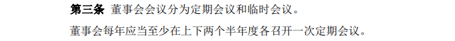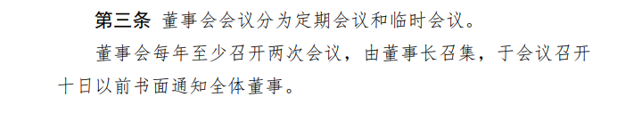 第三条微修,取消半年度至少一次的定期公告,改为每年至少两次,并由董事长召集。