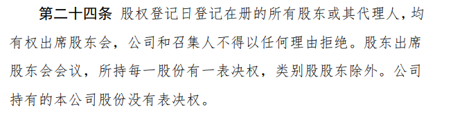 第二十四条大修。新增“股东出席股东会会议,所持每一股份有一表决权,类别股股东除外。公司持有的本公司股份没有表决权。”