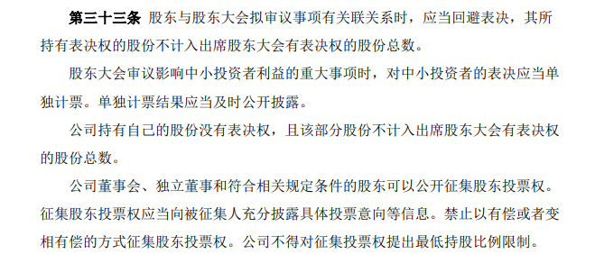 第三十六条,大修。新增“公司单一股东及其一致行动人拥有权益的股份比例在百分之三十以上的,或者股东会选举两名以上独立董事的,应当采用累积投票制。”明确告诉市场,第一大股东及其一致行动人持股比例已经超过了30%,可以采用累积投票制。