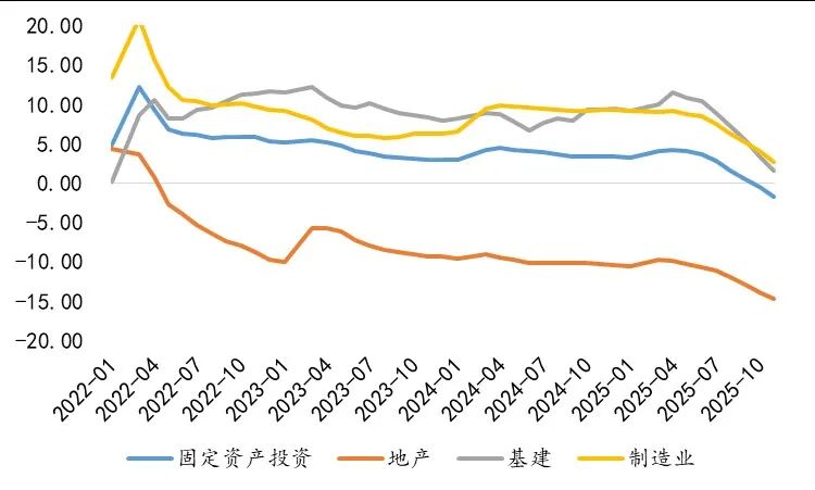 数据来源:Wind 宏观方面,11月份公布的各类数据仍反映出基本面仍相对偏弱。 经济数据方面,10月份数据同比表现延续下半年以来下滑趋势,结构上消费企稳(旅游相关、黄金涨价和购物节带动),投资端增速下行幅度扩大(地产低景气,财政错位,制造业转型)。分版块看,地产受低景气影响,需求承压,导致投资连续较大幅度回落。新老口径基建本月继续回落,与财政错位、项目不足和地方投资意愿偏低有关。10月工业增加值小幅回落,与制造业投资明显背离。外需短期下滑与制造业转型升级是主因:高技术制造业加速扩张,传统过剩行业则持续收缩。消费本月有所企稳,两年平均增速略上行,结构上主要是出行相关的餐饮,黄金涨价效应的珠宝类和购物节板块的服装、通讯器材等分项拉动,补贴政策逐步退出的家电、汽车项走弱。 图2 10月经济数据动能趋弱