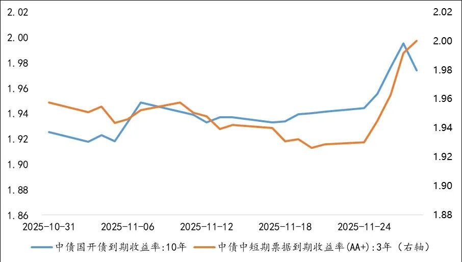2025年11月份债市呈现震荡偏弱走势,主因是市场情绪受到降息预期降温,以及销售新规潜在延后等因素扰动。其中30年期国债收益率上行4bp,10年期国债利率上行5bp,利率债曲线走出熊陡行情。信用资产表现存在分化,其中存单收益率较稳定,3年期以内普通信用资产信用利差走阔,5年左右相对较好。 往后看,短期内债市收益率水平赔率较厚,适合参与市场超调后的波段交易,但债市全面转向机会还需等待。主要原因在于,四季度央行重启国债买卖后,货币政策继续加码空间有限,降息预期有所降温,制约了机构年末抢跑行为。但下半年以来,各类经济数据略有走弱,资金面持续宽松,与当前利率水平存在一定偏离。短期内可继续关注中央经济工作释放的增量政策信号,中期来看市场仍有回归基本面的机会。