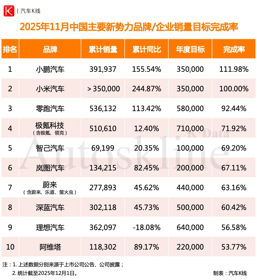 前11个月,仅三家新势力目标完成率超80%。