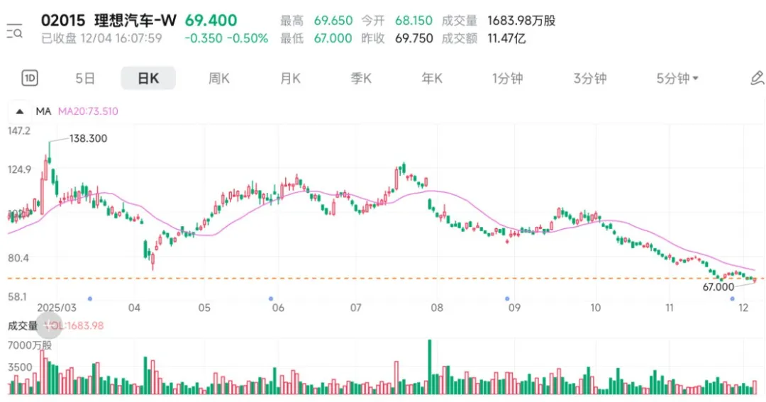 理想汽车则因销量持续疲软及三季度财报由盈转亏,港股、美股股价均已从高位显著回撤。若从年初138.3港元高点计算,到12月4日收盘,理想汽车市值蒸发超1300亿港元。$理想汽车-W(HK|02015)$