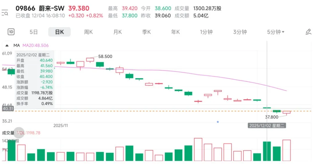 蔚来港股在12月2日大跌近7%,3日再跌3.32%,直到12月4日才终于止跌,收于39.28港元/股。