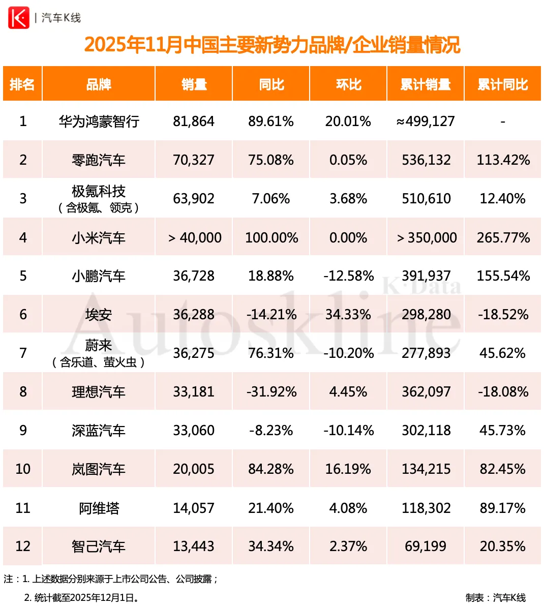 被华为鸿蒙智行反超,对于已领跑新势力4个月的零跑汽车而言,无需过多担忧。毕竟11月交付7.03万辆、同比增长75.08%的表现,足以使其保持着年累计销量的优势。