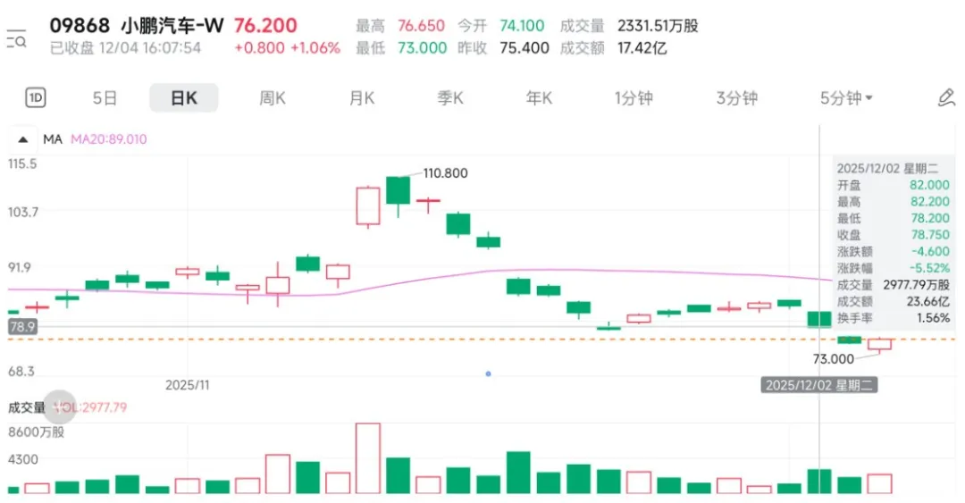 11月数据出炉后,多家上市新势力股价应声下跌。其中,12月2日小鹏汽车港股跌超5%,美股跌幅更是逼近8%,截至12月4日收盘,小鹏汽车港股报收76.2港元/股。$小鹏汽车-W(HK|09868)$