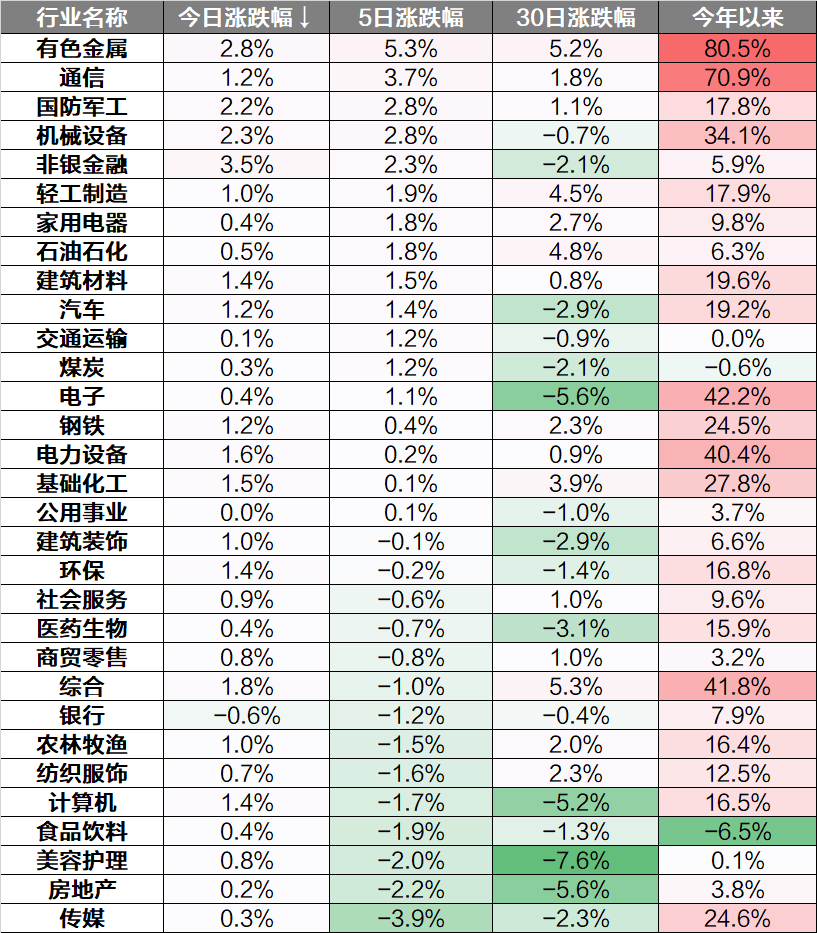 行业上看,有色金属、通信、国防军工等板块上涨,传媒、房地产、美容护理板块涨幅靠后。