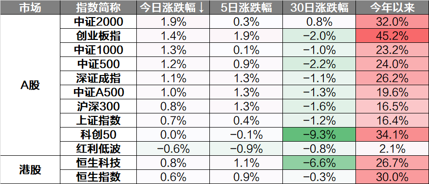 市场探底回升,核心宽基指数悉数上涨,科创200、中证2000领涨,仅红利指数、科创50下跌。