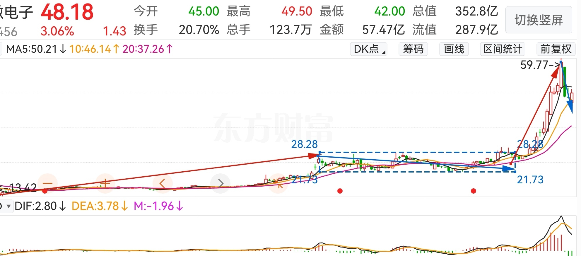第一、从日线形态上看,股价经过暴力拉升后出现快速回落,而这种回落是股价本身调整要求(多指标超买、背离),监管只是起到了推波助澜的作用……