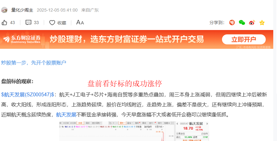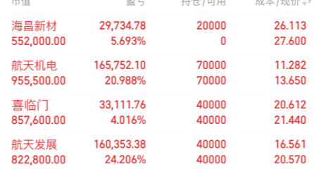 航天机电:航天+光伏,该股目前连板,走主升浪,今天再次大幅度高开4%左右,因为涨幅太高,很多人不好追,但我们有先手,而且高开说明该股继续强者恒强,开盘震荡后快速冲击涨停,虽然盘中炸板几次,但尾盘和航天发展双双封死,封单9000万,目前三连板,下周溢价拉升要注意可能会断板,到时候看是否继续强者恒强,一旦断板拉升力度受阻考虑落袋,如果继续走妖在继续格居。所以早盘很重要。
