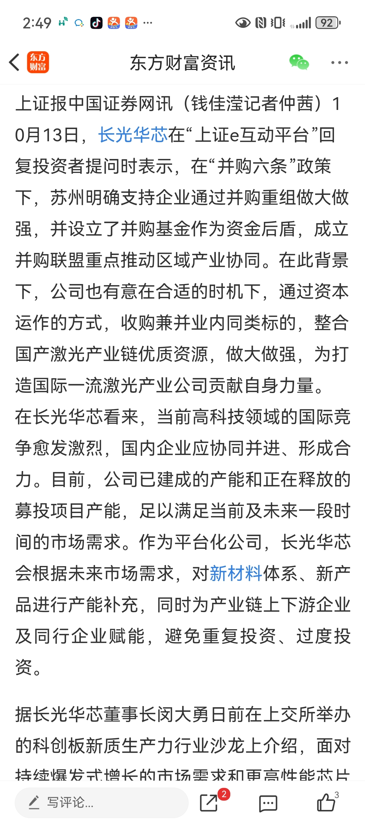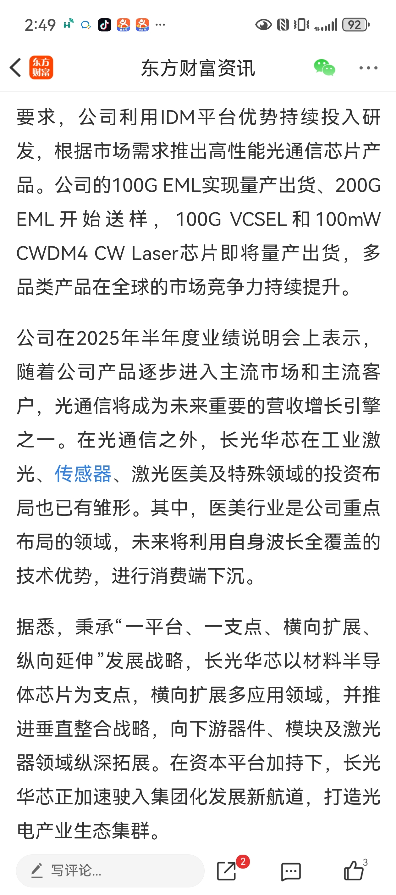 2;光通信与数据中心,公司100G EML已实现量产,订单从今年二季度开始在持续批量且顺利交付中,客户反响非常好。200G EML正在客户验证中。据公开消息显示,长光华芯二期厂房已经投产,产能处于爬坡和释放阶段。硅光芯片领域也成立了专门的子公司,紧跟国际领先水平。