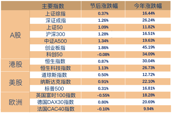 上周A股缩量震荡,日均成交额16961.78亿元,较前一周日均17369.23亿元下降2.33%。指数表现方面,全周上证指数上涨0.37%,深证成指上涨1.26%,沪深300上涨1.28%,中证A500上涨1.34%,创业板指上涨1.86%,科创50下跌0.08%。港股市场震荡回升,恒生指数上涨0.87%,恒生科技上涨1.13%。