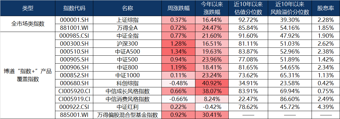上周A股市场震荡向上,主要宽基指数收涨,仅科创综指录得小幅负收益。风格方面,成长、红利表现相对较好,消费表现较弱。基金指数方面,万得偏股混合型基金指数上周上涨0.92%,年内收益30.41%。