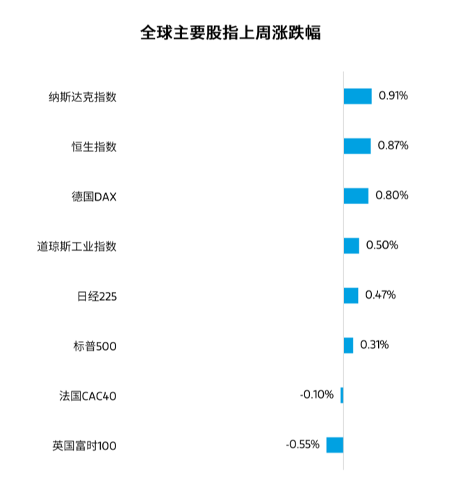 上周,投资者在美联储议息会议前保持观望态度,全球主要股指波动不大。美股方面,纳斯达克指数上涨0.91%,标普500指数上涨0.31%,道琼斯工业指数上涨0.50%。港股方面,恒生指数上涨0.87%。