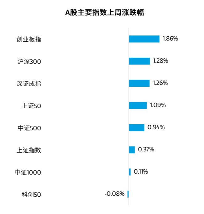 上周,A股三大指数全线收涨。截至上周五收盘,上证指数上涨0.37%重返3900点之上,深证成指上涨1.26%,创业板指上涨1.86%。