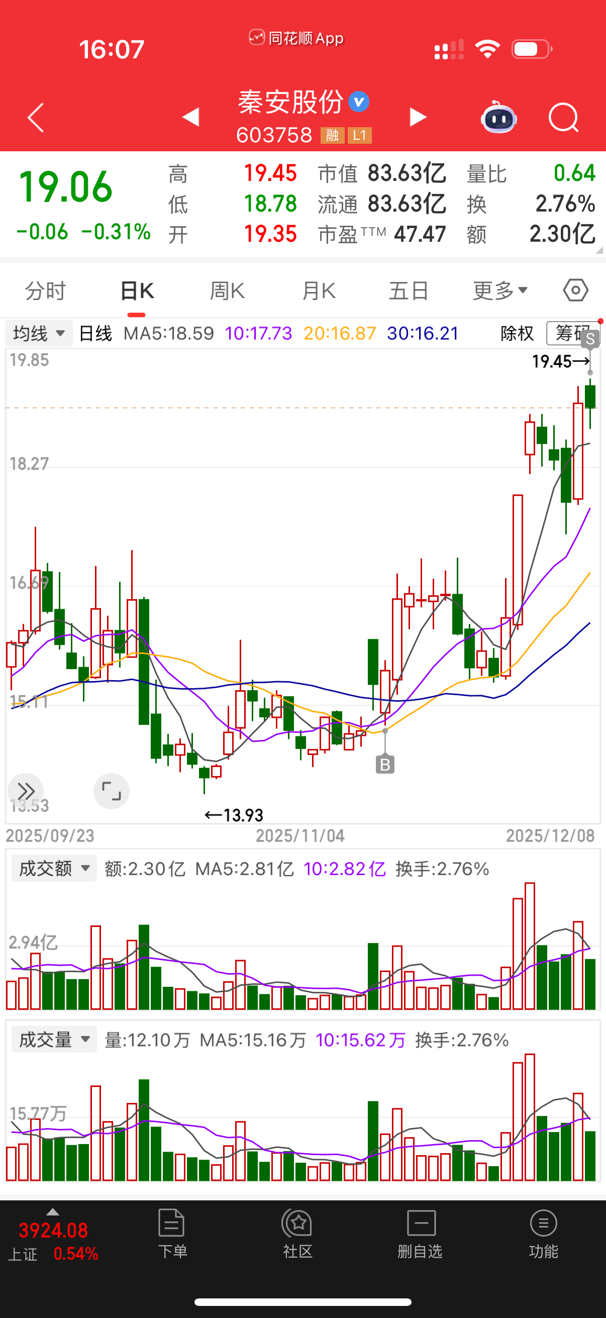 秦安股份日线高开低走,收盘在10日线上方,还会考验5日线的支撑,只有突破前期高点,趋势才会扭转,周线已经运行5日线上方,周线KDJ指标拐头向上了,月线已经运行到5日线上方,月线MACD指标已经金叉了