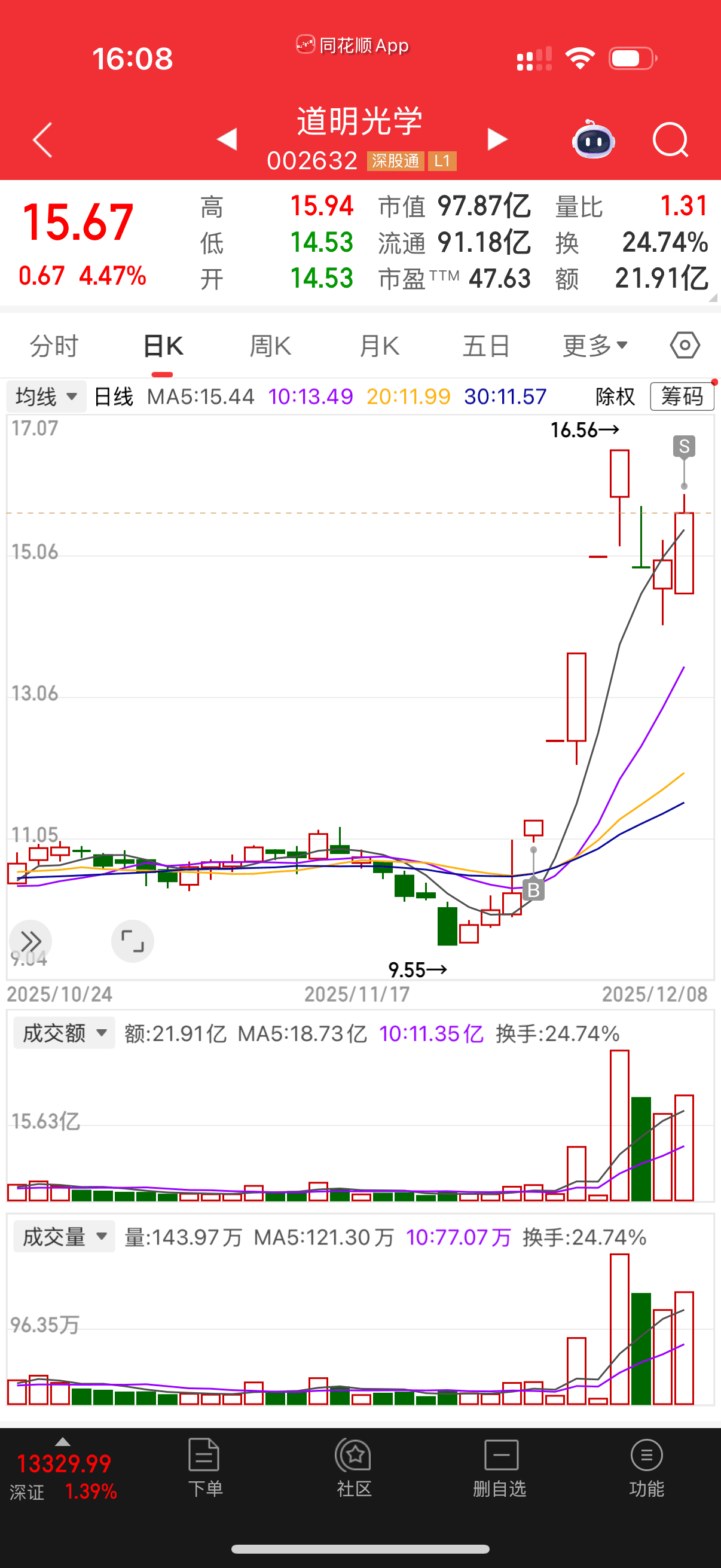 道明光学日线低开高走,收盘在20日线上方,还会考验10日线的支撑,只有突破前期高点,趋势才会扭转,周线已经运行5日线上方,周线KDJ指标拐头向上了,月线已经运行到5日线上方,月线MACD指标已经金叉了
