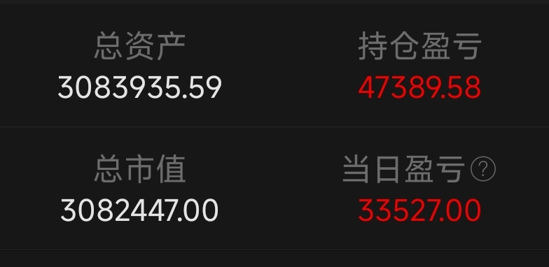 当前总资产308w,今日盈利3.3w,总仓位满仓,目前总盈利108w 。