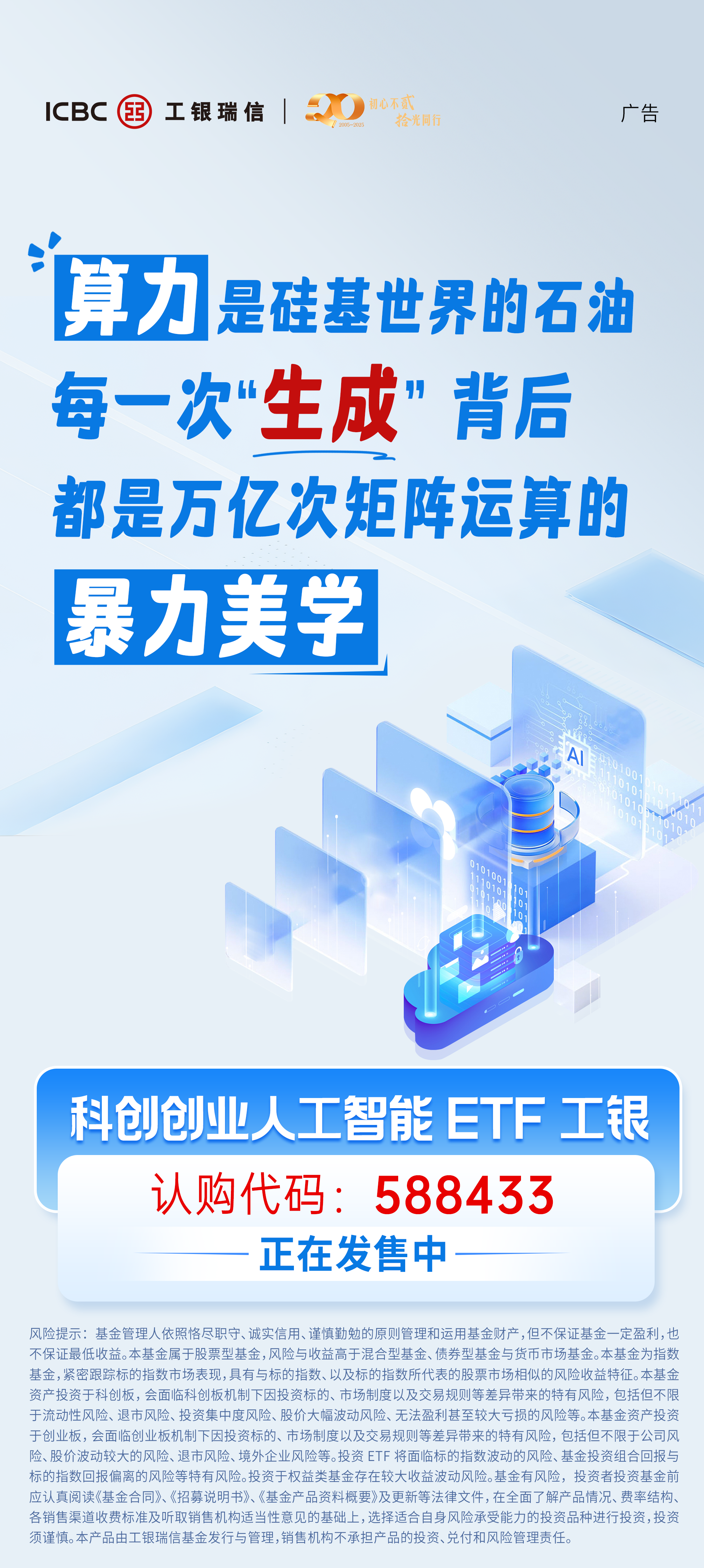 这也是科创创业人工智能ETF工银(认购代码:588433)存在的意义——它不是一张赌桌上的彩票,而是一张通往算力时代的“基础设施通票”。