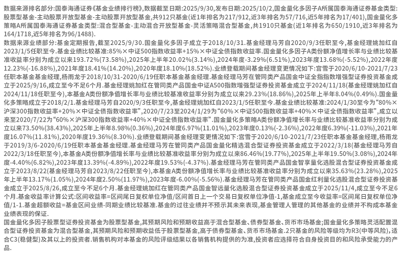 风险提示:国金科创创业量化选股股票型证券投资基金、国金量化多因子股票型证券投资基金 2 只基金为股票型基金,上述 2 只基金的预期风险和预期收益均高于混合型基金、债券型基金、货币市场基金;国金量化多策略灵活配置混合型证券投资基金为混合型基金,其预期风险和预期收益低于股票型基金,高于债券型基金、货币市场基金。国金科创创业量化选股股票型证券投资基金的风险等级为 R4 (中高风险), 适合 C4 (积极型) 及其以上的投资者;其他 2 只基金的风险等级均为 R3 (中等风险), 适合 C3 (稳健型) 及其以上的投资者。销售机构对以上 3 只基金的风险评级结果以各销售机构提供的为准,投资者应选择符合自身投资目的和风险承受能力的产品。国金基金承诺以诚实信用、勤勉尽责的原则管理和运作基金资产,但不保证基金一定盈利,也不保证最低收益。基金的过往业绩及其净值高低并不预示其未来业绩表现,基金管理人管理的其他基金的业绩并不构成以上 3 只基金业绩表现的保证。投资前请认真阅读《基金合同》《基金产品资料概要》《招募说明书》等法律文件。本宣传推介材料由国金基金提供,涉及的基金产品由国金基金发行与管理,销售机构仅提供基金销售相关服务,不承担产品的投资、兑付责任。本材料制作时间:2025 年 11 月 7 日。
