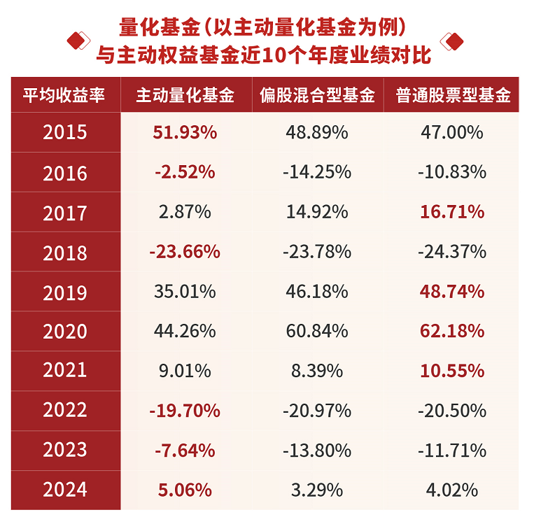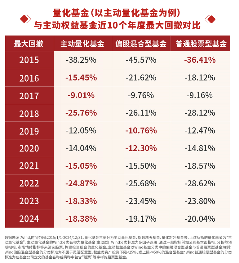 长期表现验证:近 10 年中,量化基金(以主动量化基金为例)在 6 个年度跑赢主动权益基金,且最大回撤相对较小。