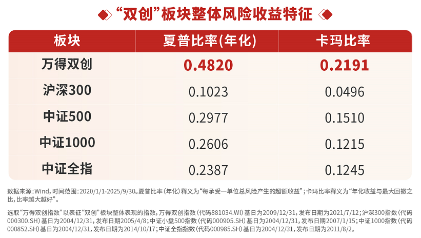 双创板块(以万得双创指数为例)夏普比率、卡玛比率显著高于沪深 300、中证 500 等主流宽基指数,风险收益性价比更优,以承担可控的、阶段性的较高波动为代价,换取产业变革带来的长期增长空间。