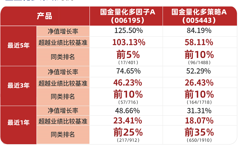 国金量化策略中长期业绩超额及排名表现不俗,以国金量化团队管理时间最长的公募主动量化产品 “国金量化多因子、国金量化多策略” 为例。