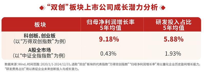 “双创” 板块 9.18% 的归母净利润年复合增长率,数倍于全市场平均水平,直观验证了 “双创” 板块企业作为新质生产力代表的强劲盈利增长动能;同时,5.88% 的持续高研发投入,是维持 “双创” 板块企业业绩高增长的核心引擎。