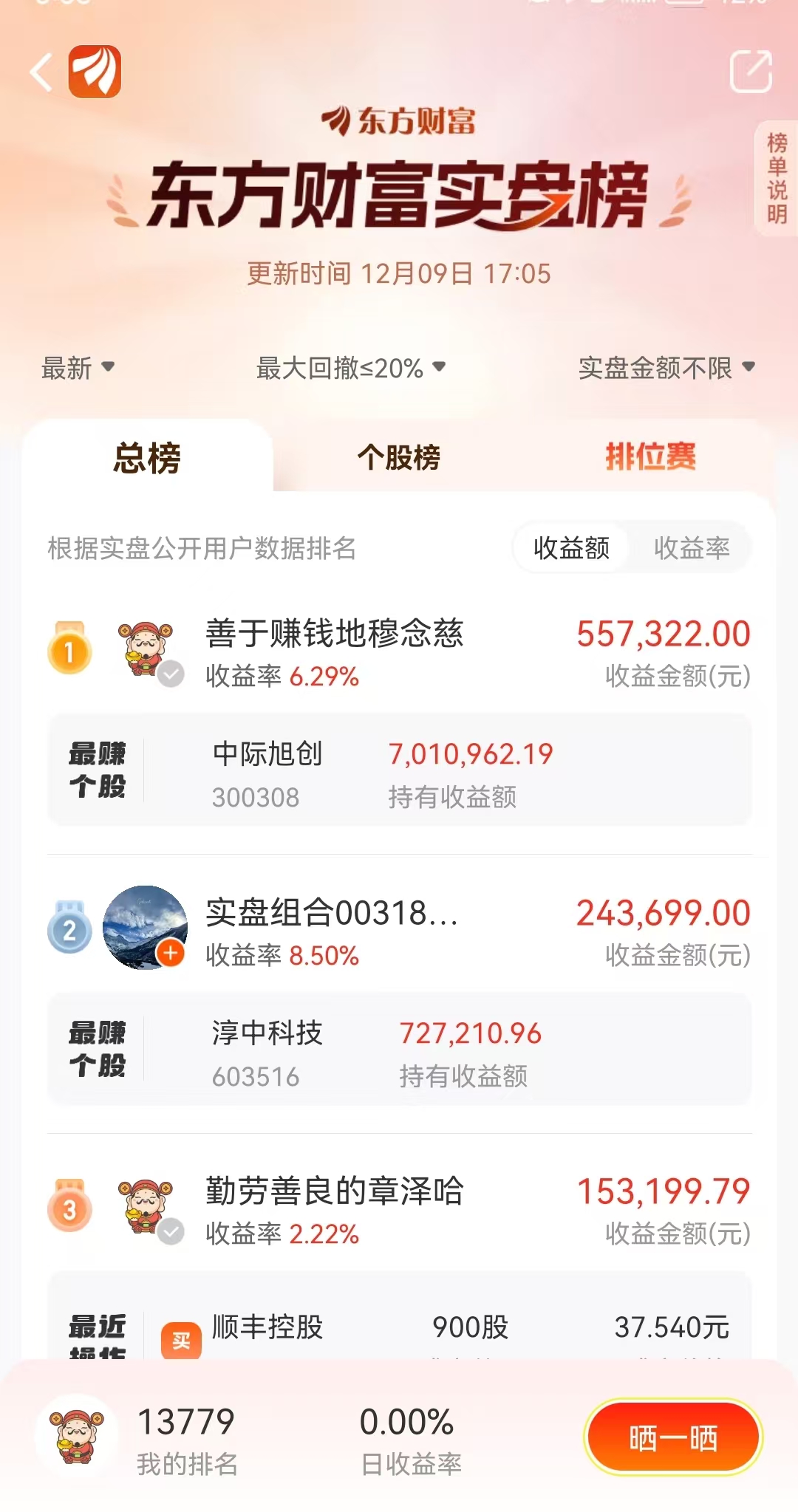 存量资金博弈下,市场格局呈现极端分化,过度依赖大金融与AI的跷跷板效应,导致其余行业板块缺乏健康轮动,操作难度进一步加大。东财实盘榜上,神秘高手们又是如何踩准市场节奏的?最新收益额榜前三名如下: